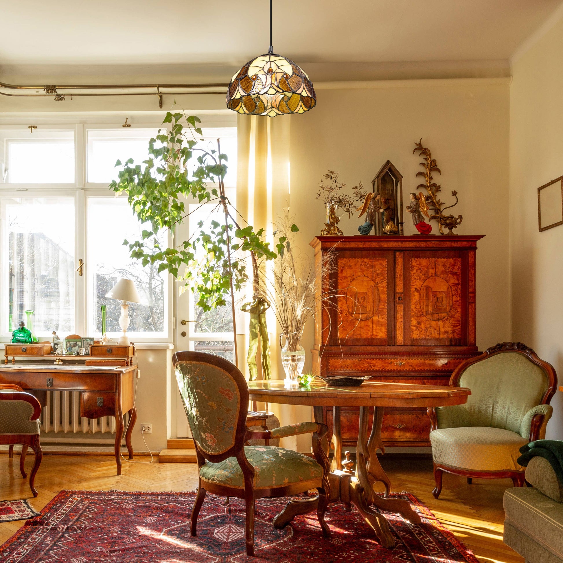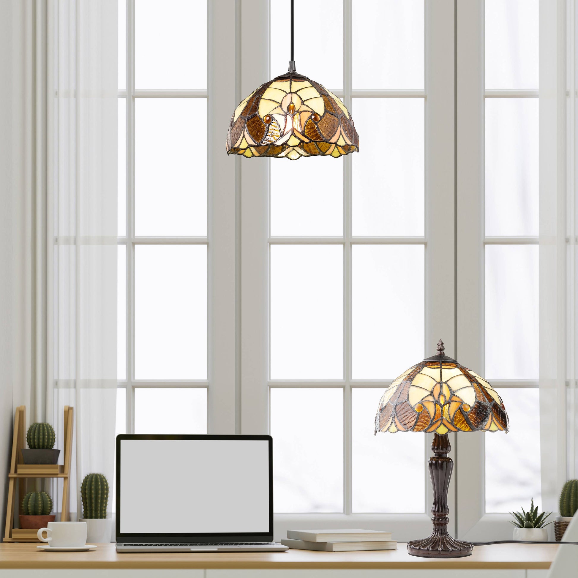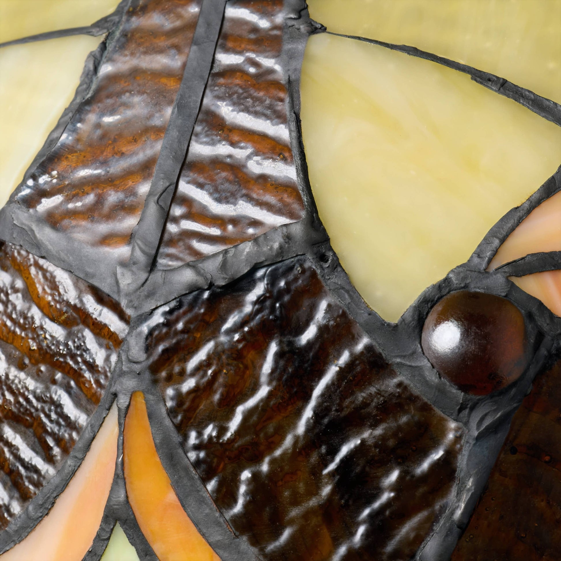 Tiffany-style stained glass dome shade in amber, brown, yellow, and ivory