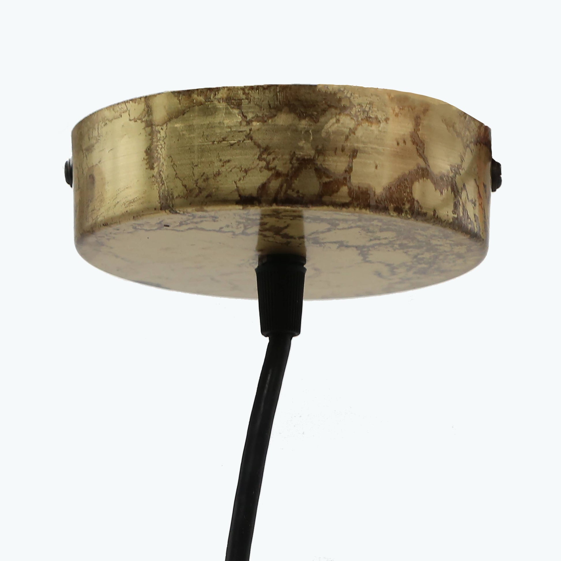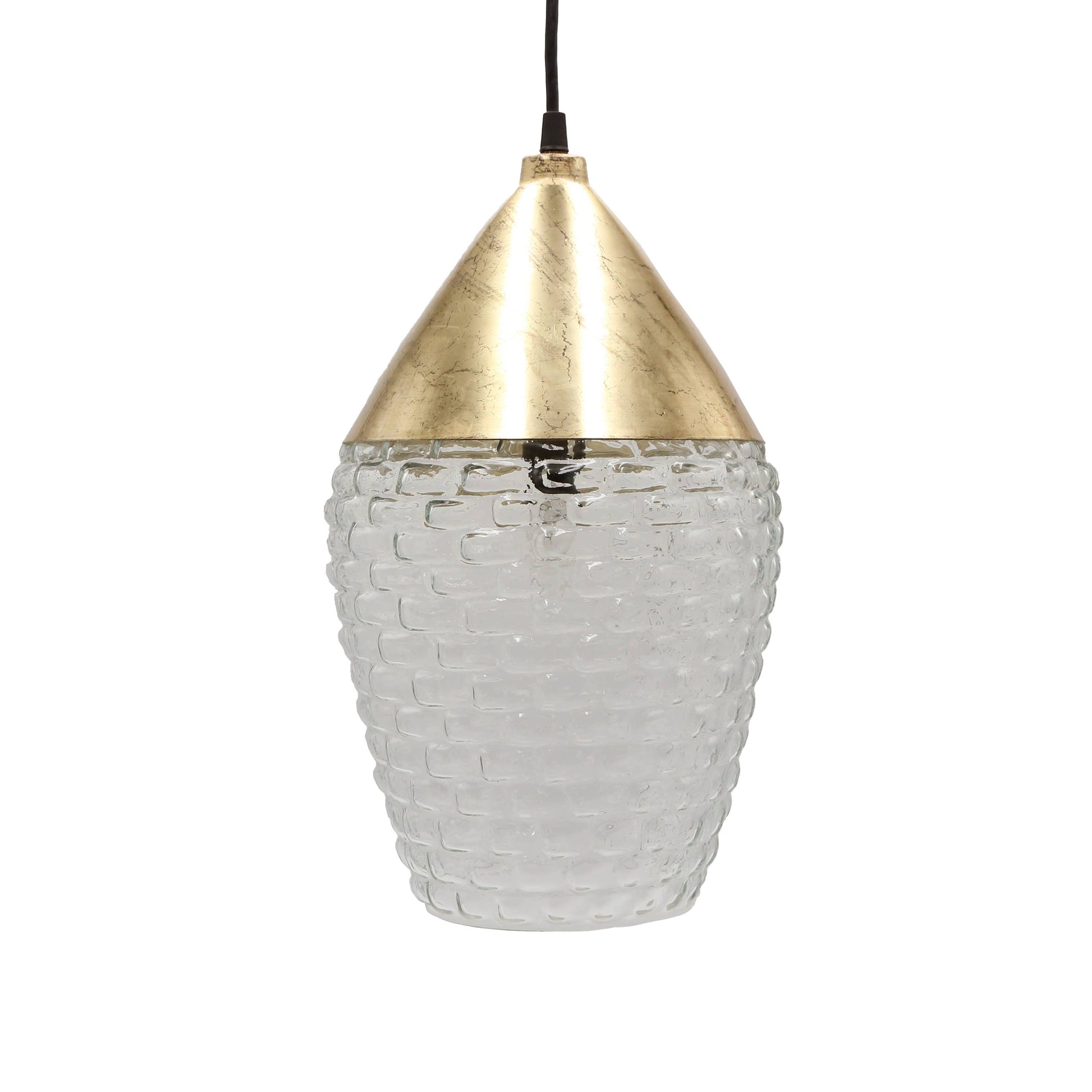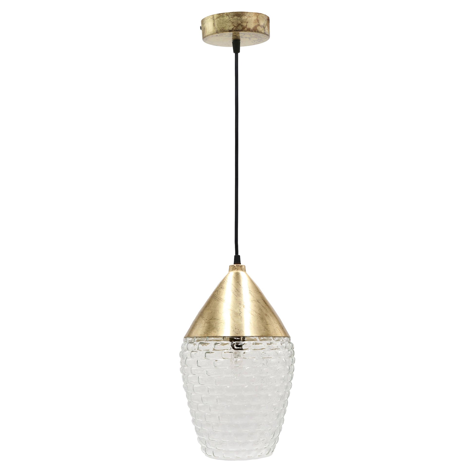 Metal with brushed gold-finish fixture and canopy and clear textured glass shade for a luxe