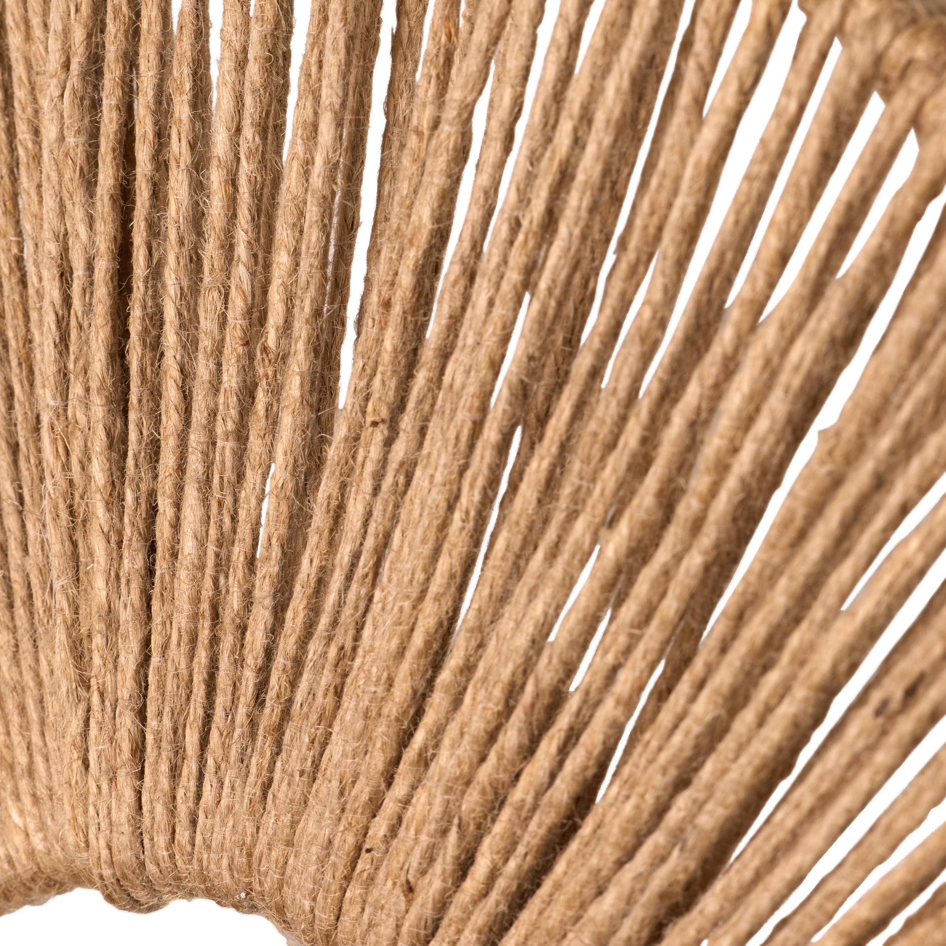 Woven round jute shade features an exposed bulb design with a contemporary or boho look