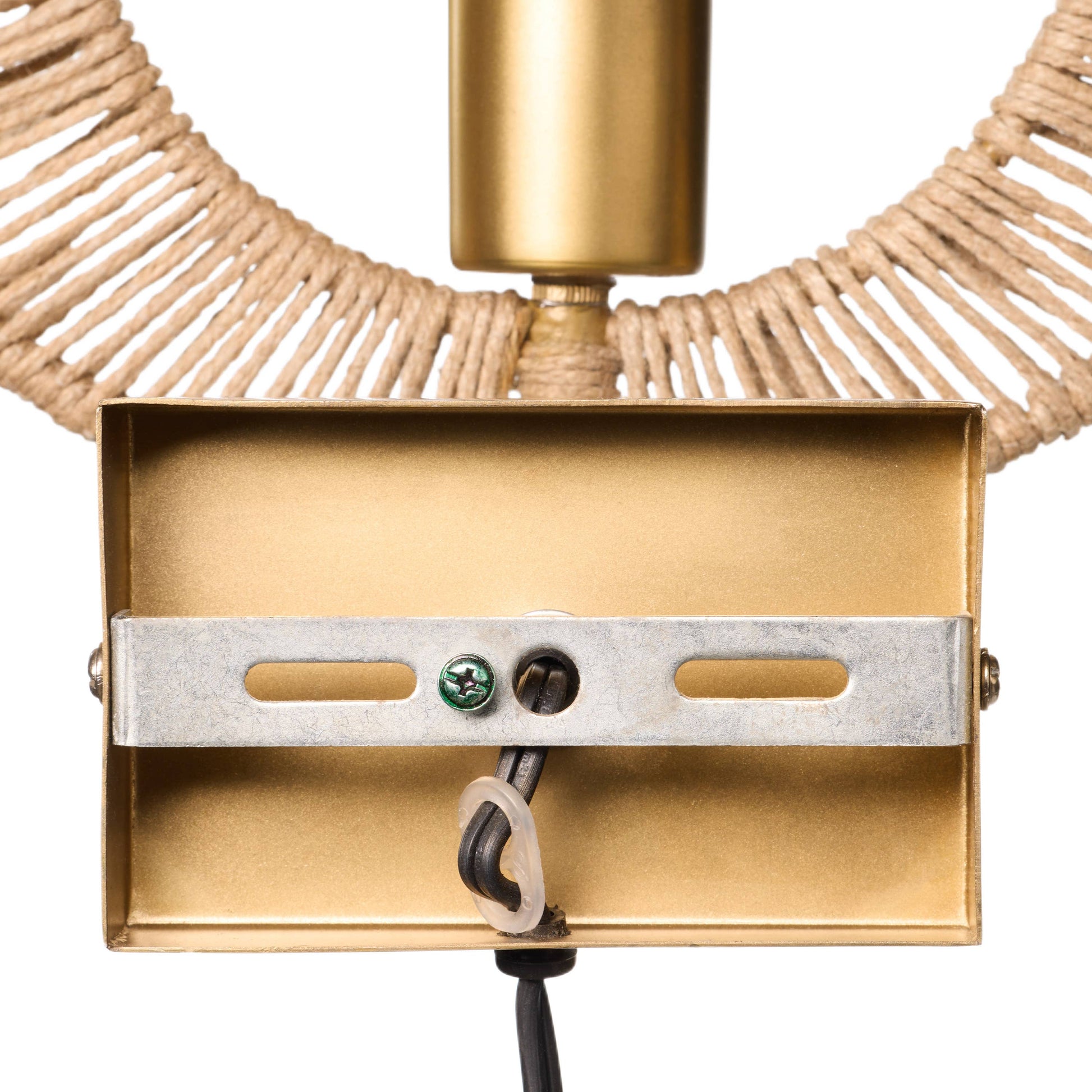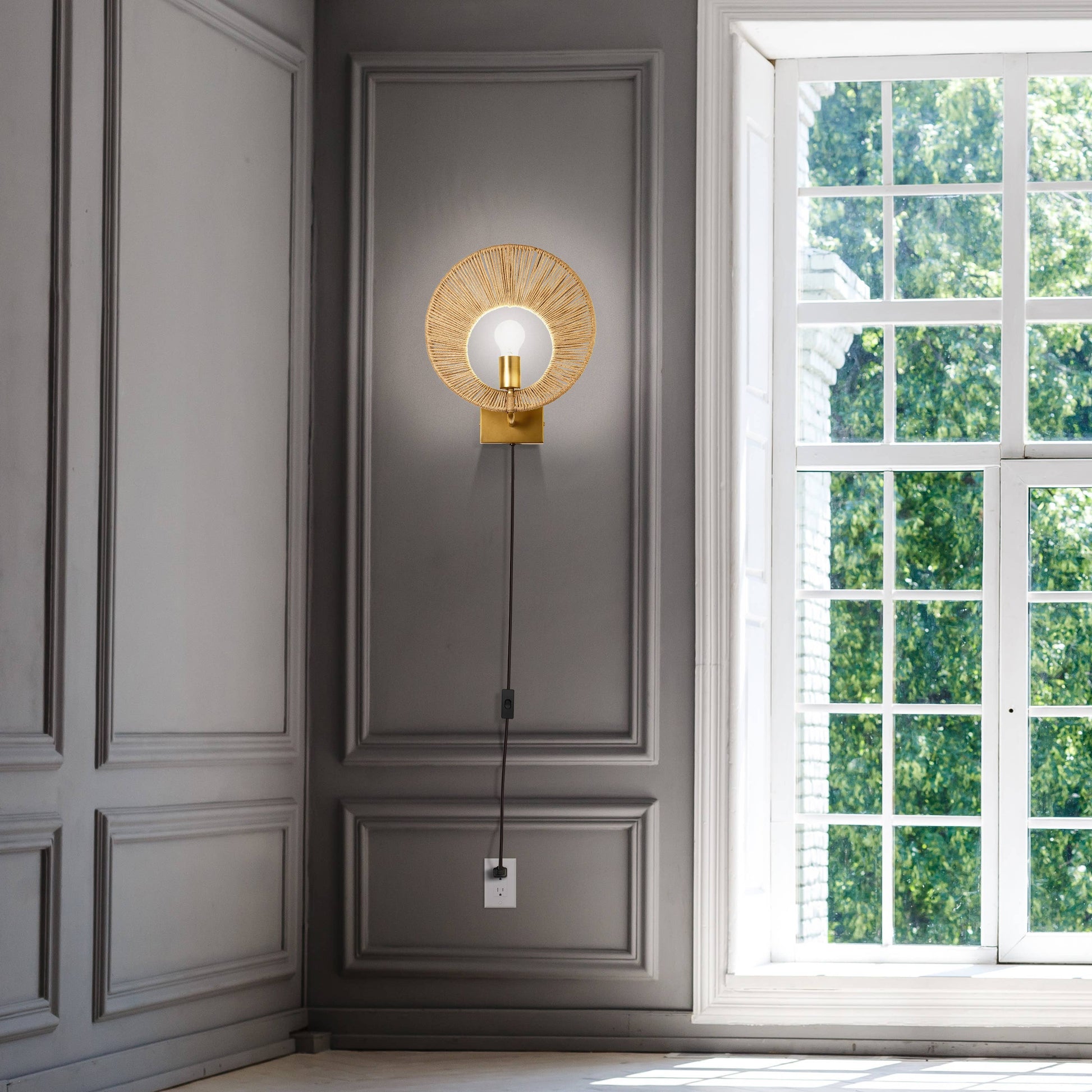 The 15"H Cass Modern Indoor Plug In Wall Sconce from River of Goods offers a stylish way to enhance your home lighting. A combination of metal and jute in a brushed gold finish, this piece presents a contemporary yet warm look that blends seamlessly with various décor styles. The woven flat circular disk design of the shade adds a unique touch, casting multi-directional light throughout the room. Easily mounted and plugged in, this sconce is perfect for adding ambiance to any indoor space without needing a complex installation.