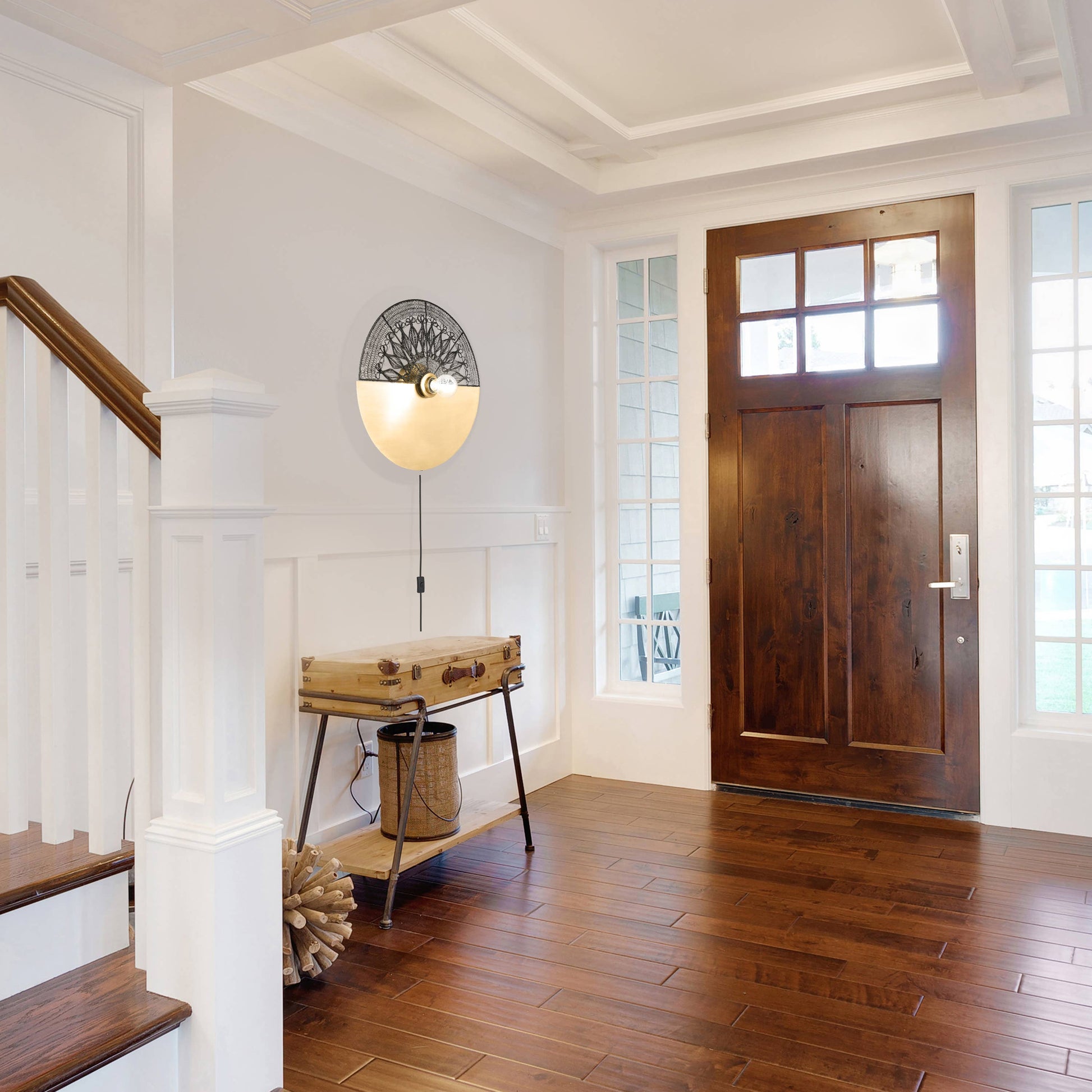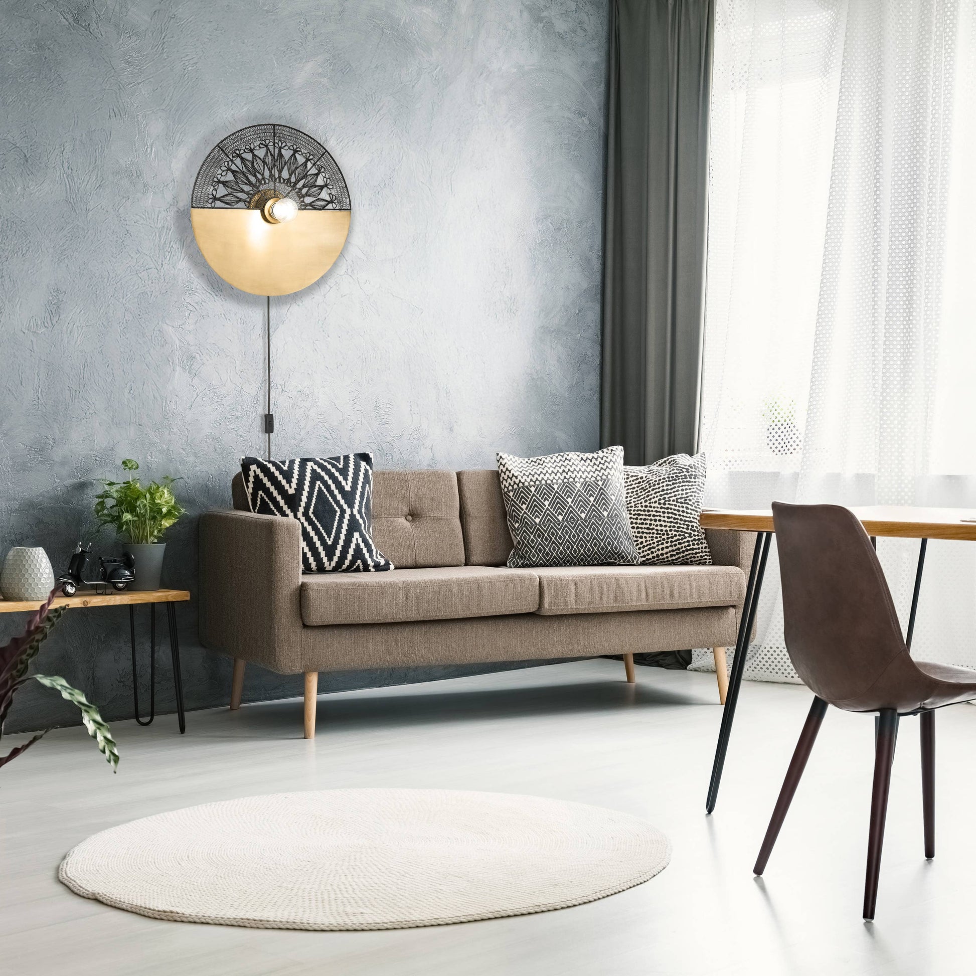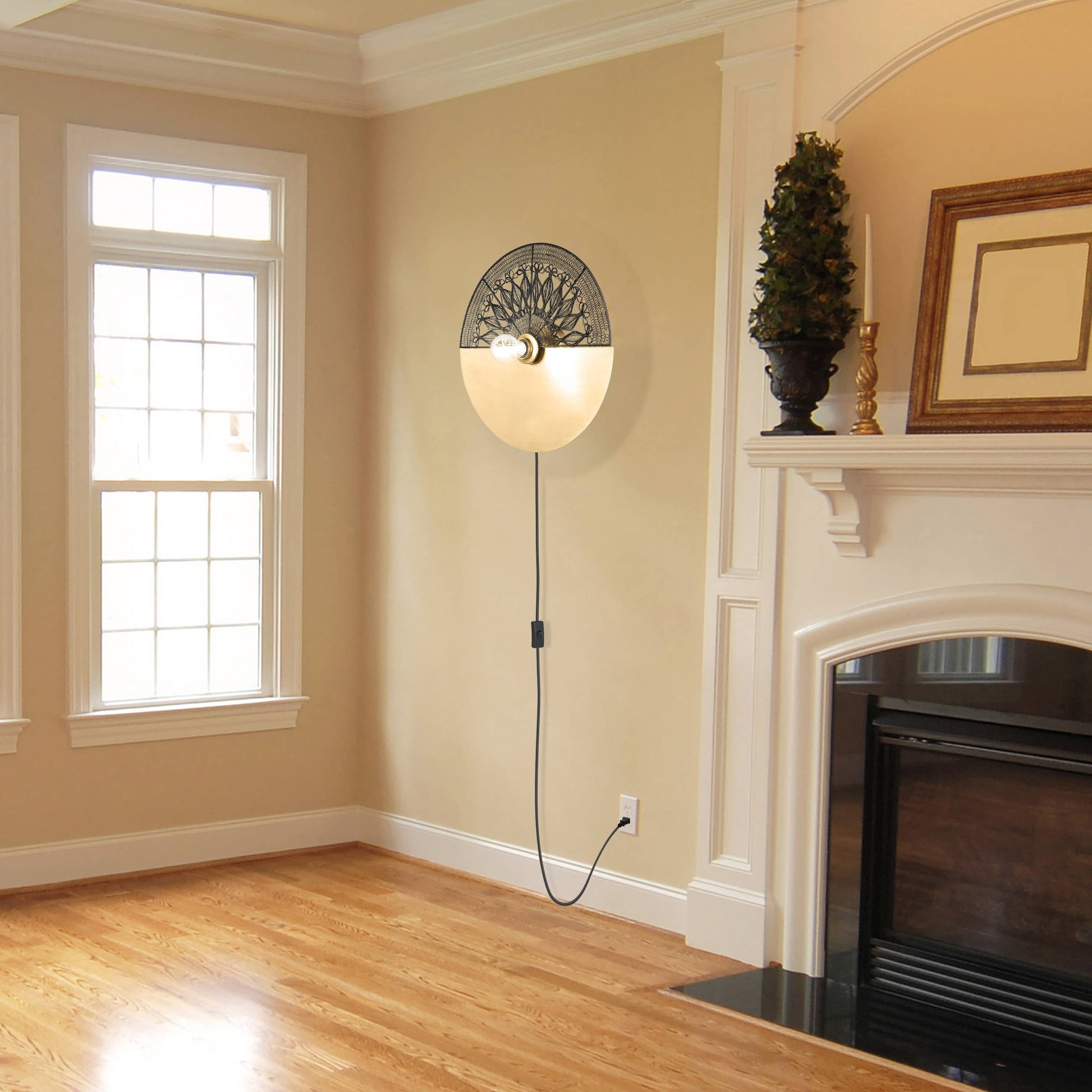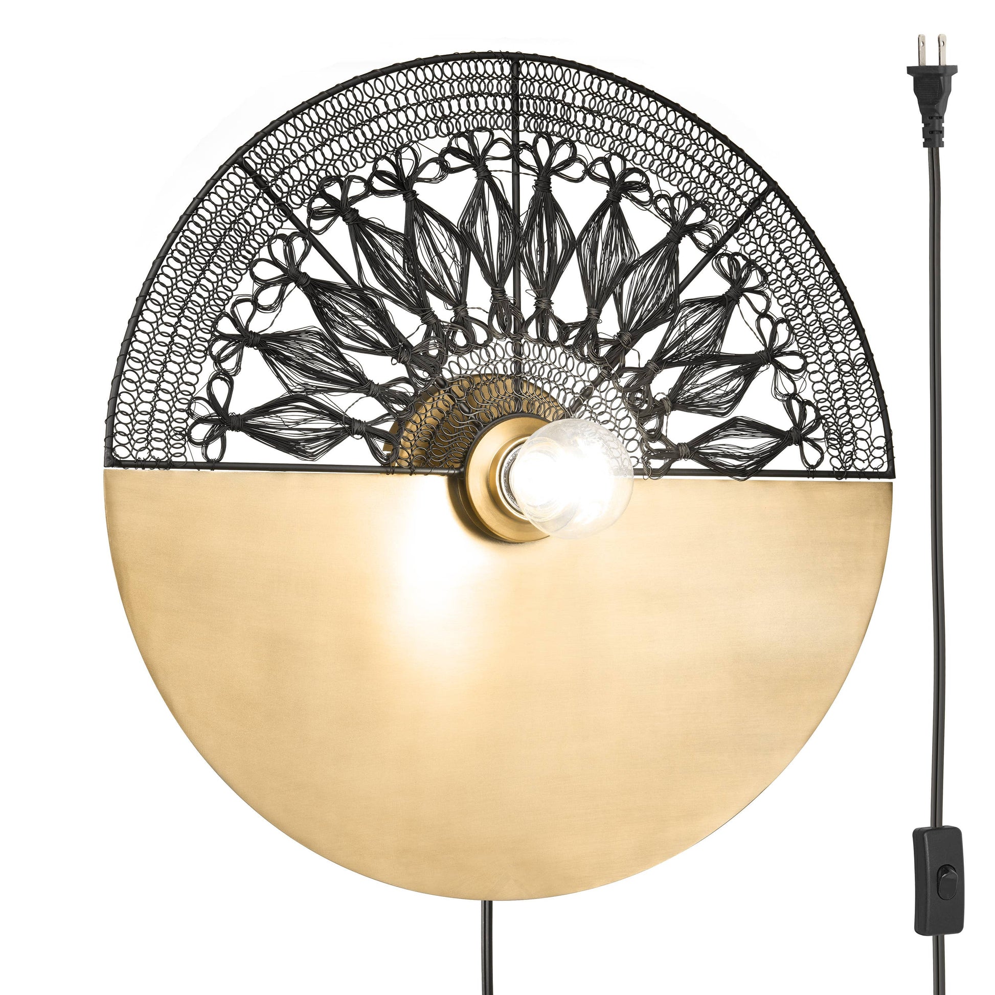 The 17.5"H Quintin Modern Indoor Plug In Wall Sconce from River of Goods is a sophisticated addition to any interior space. This unique lighting fixture offers a striking combination of black and gold hues which effortlessly complements a variety of decor styles. The Quintin features a round shade with a distinct lace-like black design that adds an artistic flair to your walls, providing both style and soft illumination. With its plug-in design, it's incredibly easy to set up and reposition, perfect for those who appreciate both aesthetics and functionality. ETL listed, this modern piece is a hassle-free lighting solution that requires a 40 watt A-type bulb (not included), facilitating your lighting customization whatever your mood or need. With all these features, the Quintin sconce not only brightens your space but also elevates your decor for an inviting ambiance.