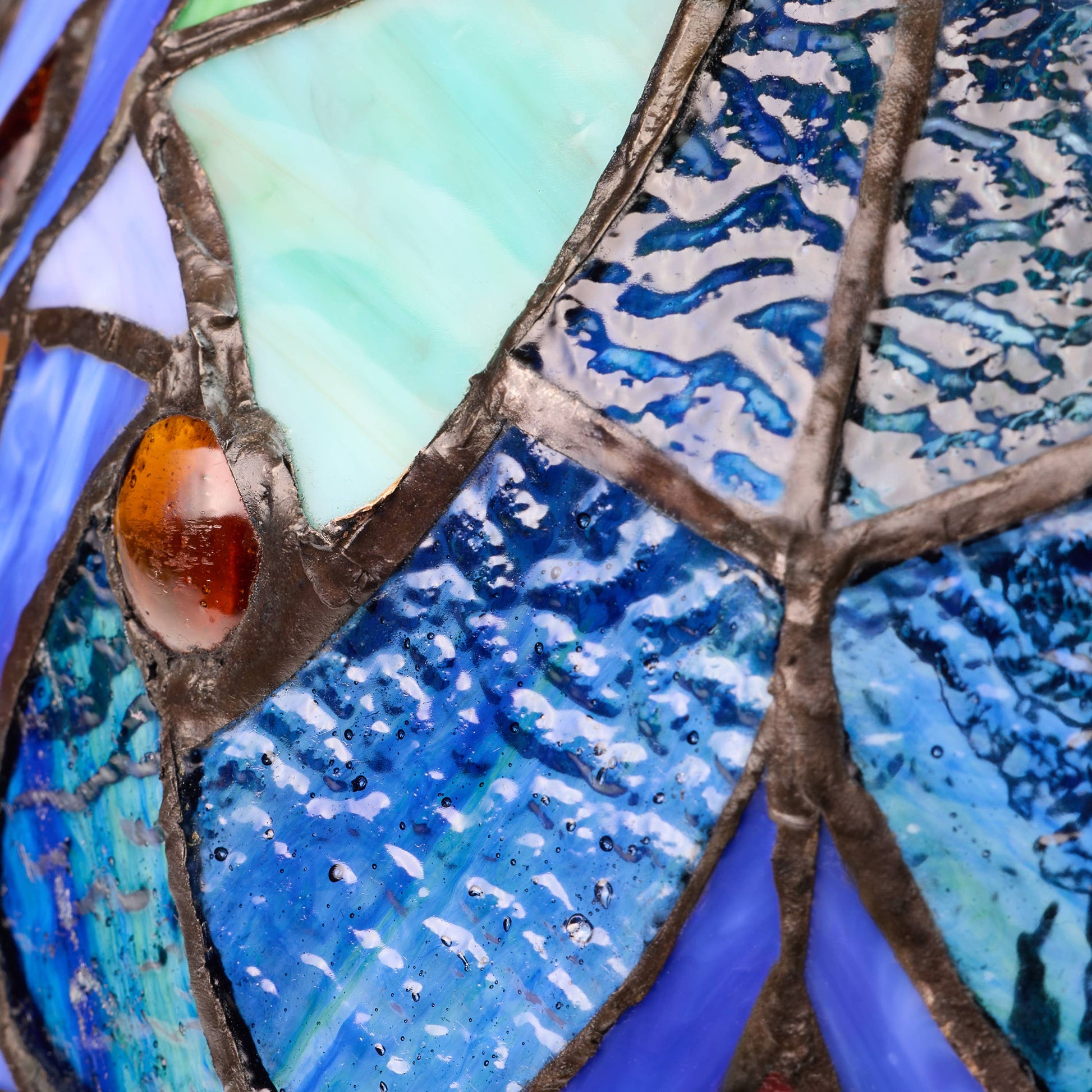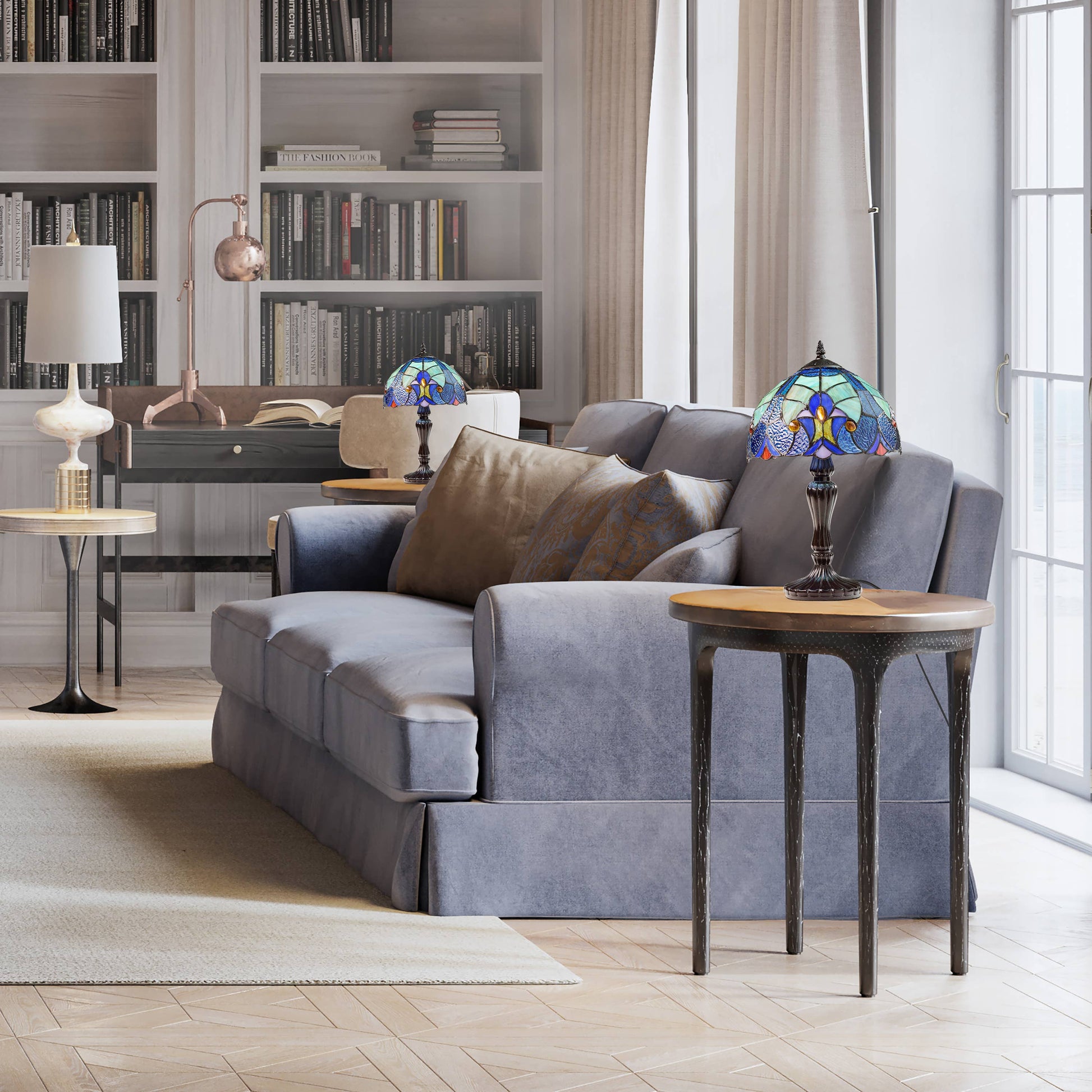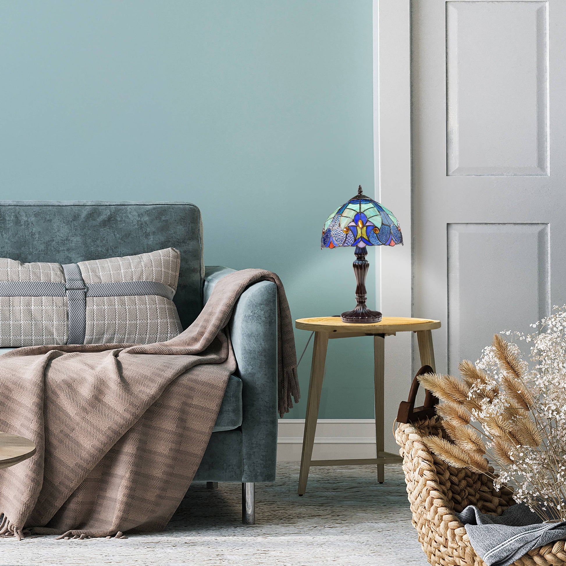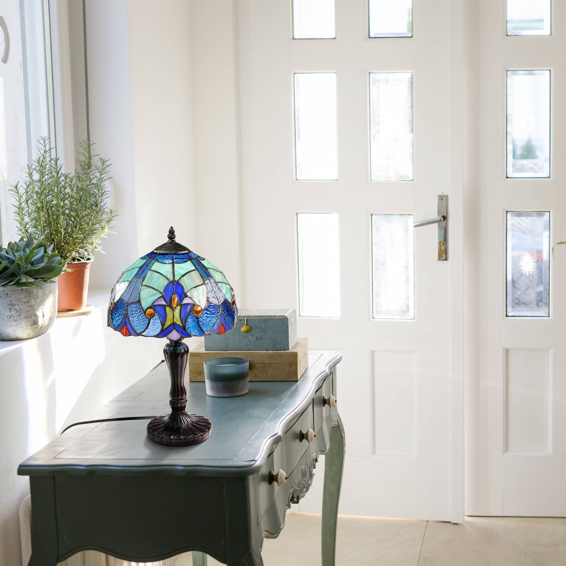 The 17"H Halston Candlestick Base Dome Shade Table Lamp from River of Goods combines classic elegance with vivid colors, creating a captivating piece for any room. The stained glass shade features 128 intricately cut pieces in a Tiffany-style design, showcasing a classic fleur de lis pattern in rich hues of blue, red, amber, and green. This exquisite lamp rests on an elegantly designed brown candlestick-style metal base that complements the vibrant shade. Illuminate your space with this mesmerizing light fixture, perfect for adding both warmth and character to your home.