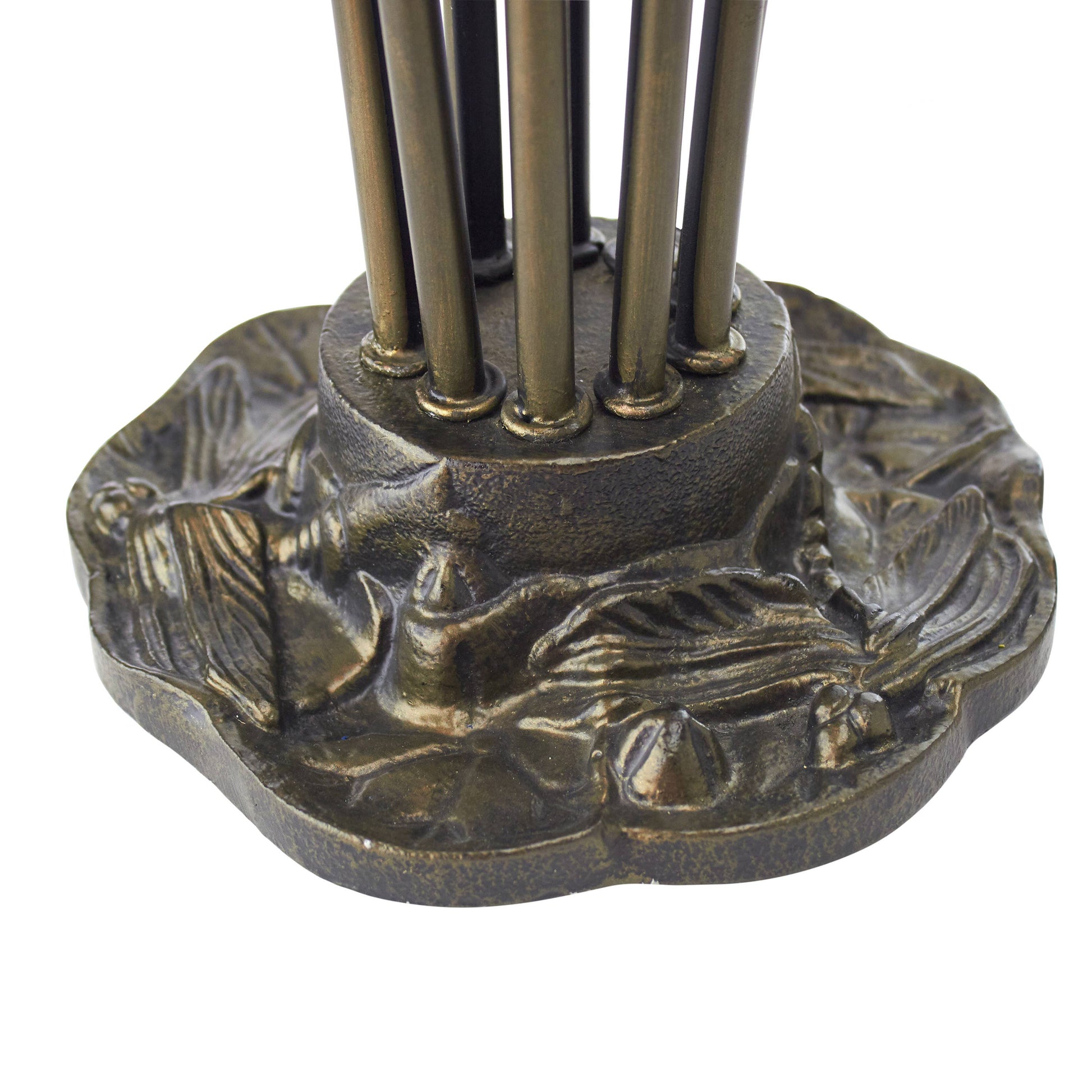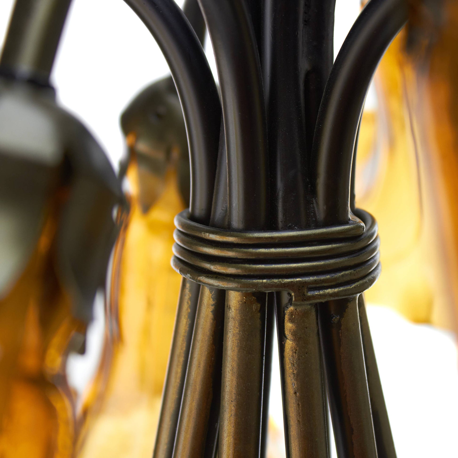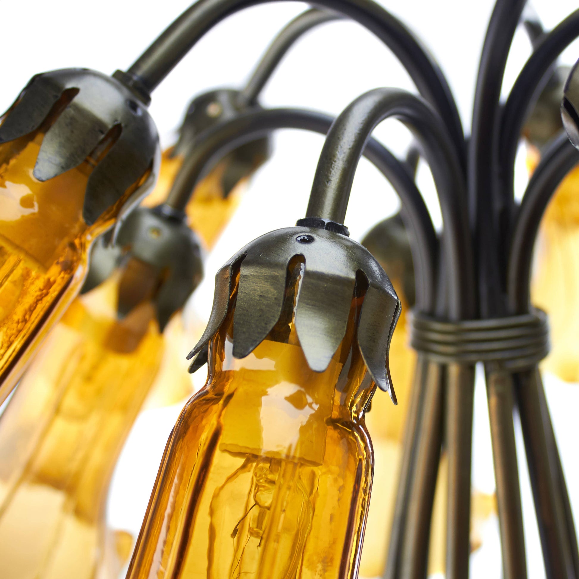 The 21"H Lily 10 Light Amber Shade Table Lamp from River of Goods marries vintage and traditional styles to create a beautiful and unique lighting option for a bedroom, living room or entryway. Showcasing a brushed bronze-finish novelty metal base that depicts stems leading up to floral-style amber glass bell shades, this table lamp casts a soft glow with ten 15-watt E12 bulb (not included). A great pairing with Bohemian, transitional or eclectic decor, it also features a 65-inch cord with an in-line switch for versatile placement.