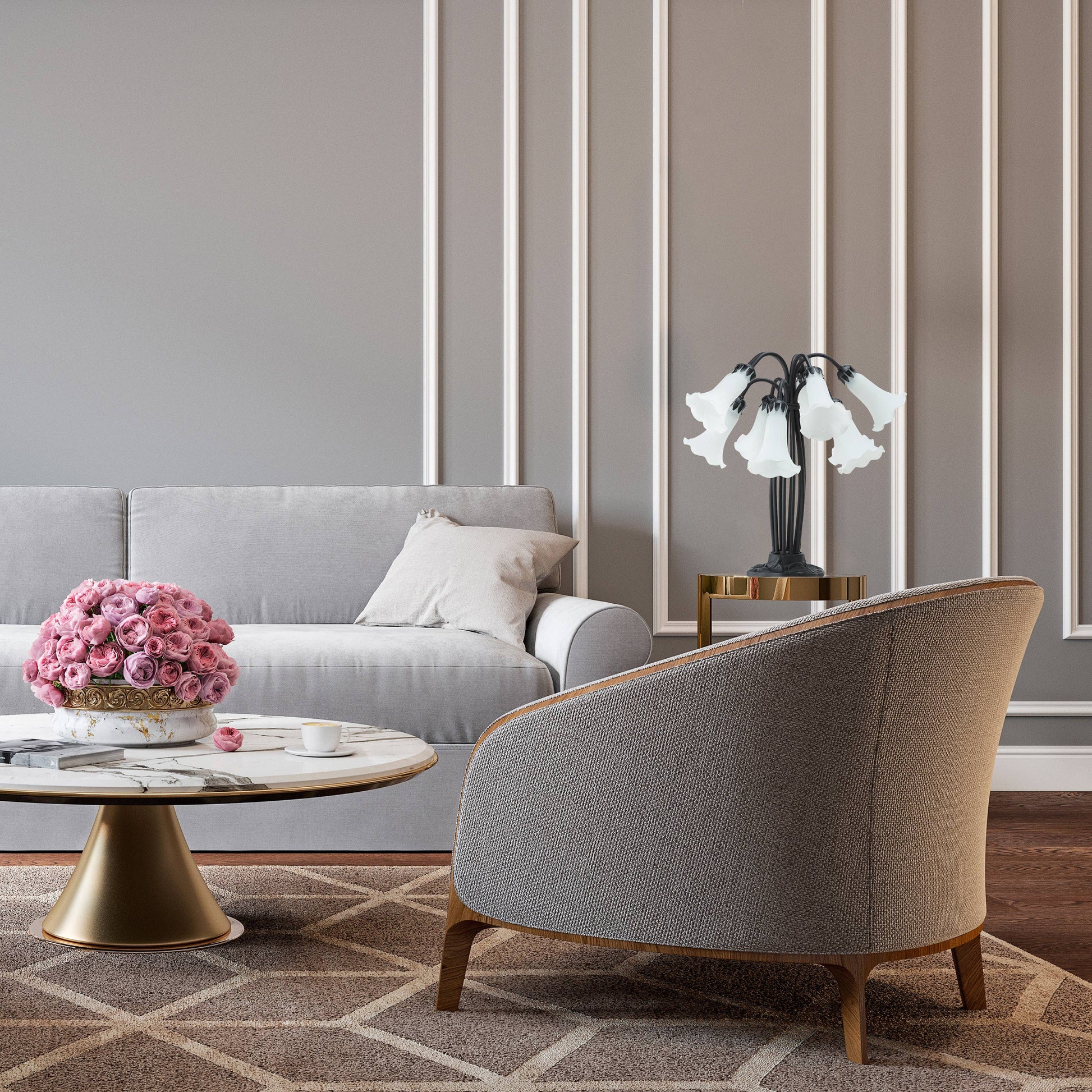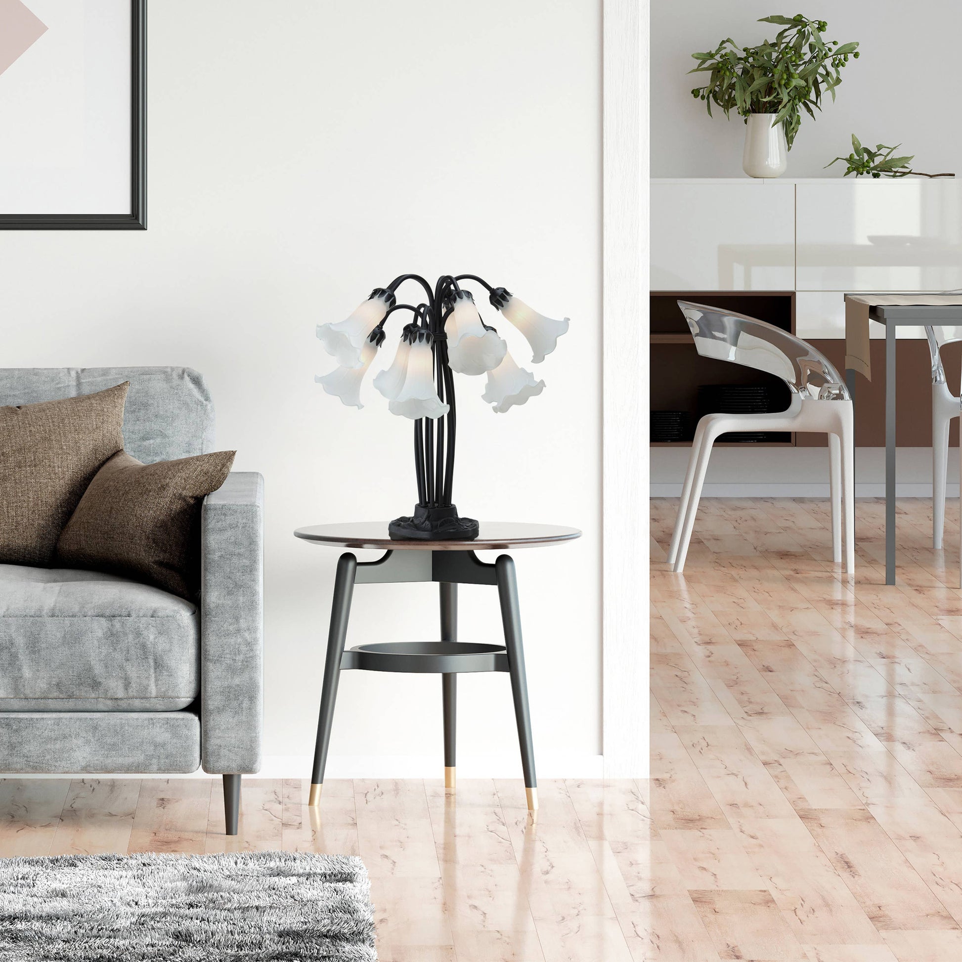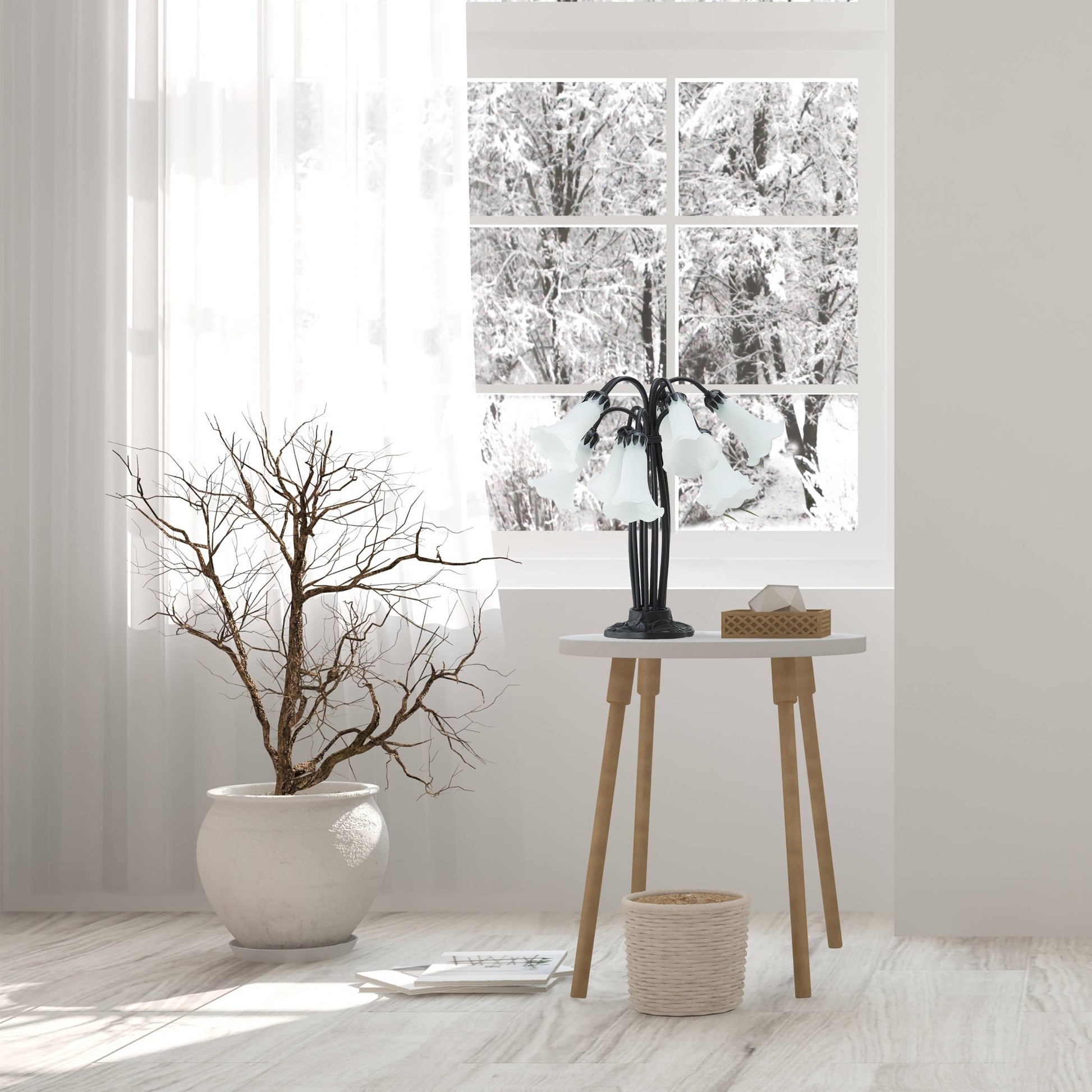 The 21"H Lily 10 Light White Shade Table Lamp from River of Goods marries vintage and traditional styles to create a beautiful and unique lighting option for a bedroom, living room or entryway. Showcasing a black-finish novelty metal base that depicts stems leading up to floral-style white glass bell shades, this table lamp casts a soft glow with ten 15-watt E12 bulb (not included). A great pairing with Bohemian, transitional or eclectic decor, it also features a 65-inch cord with an in-line switch for versatile placement.