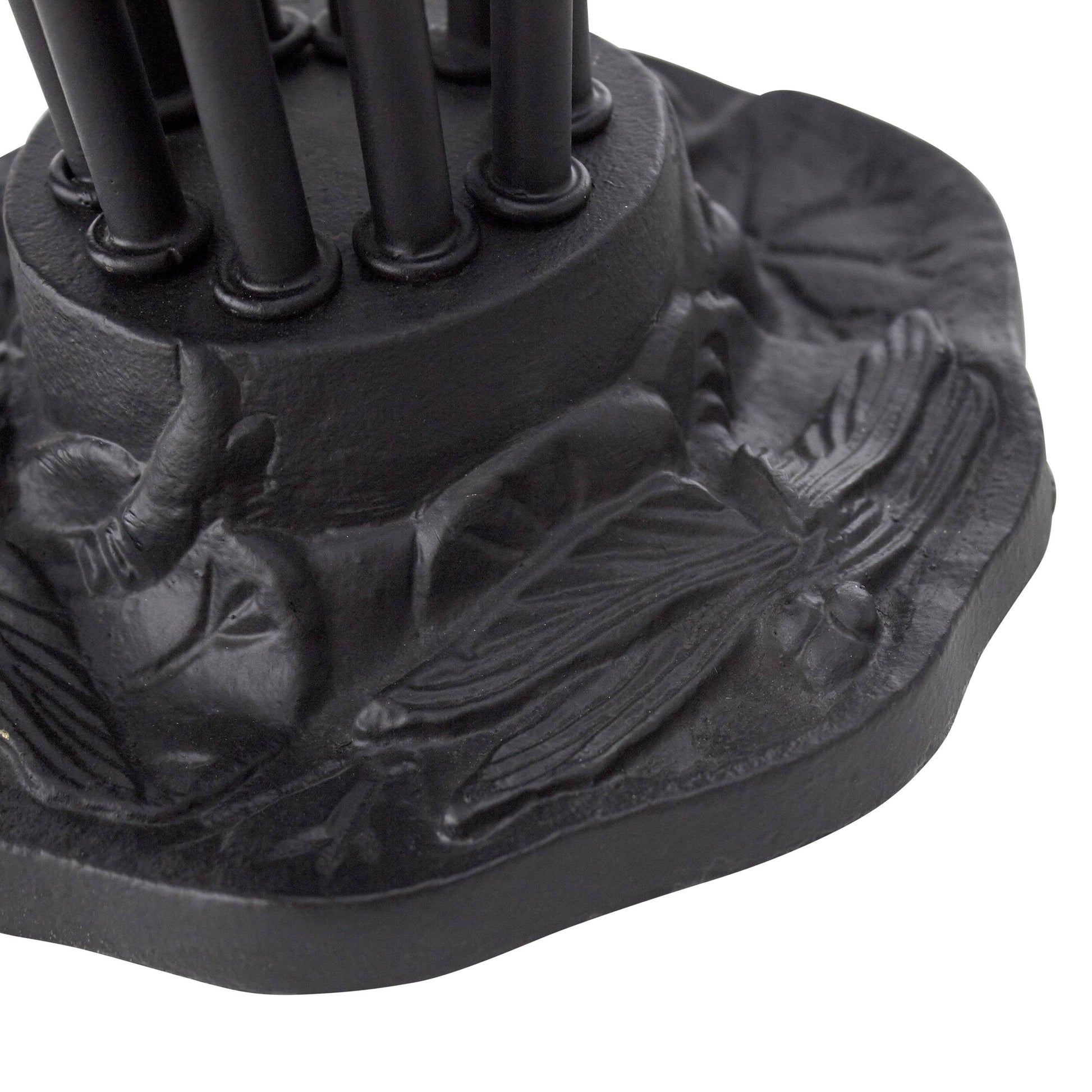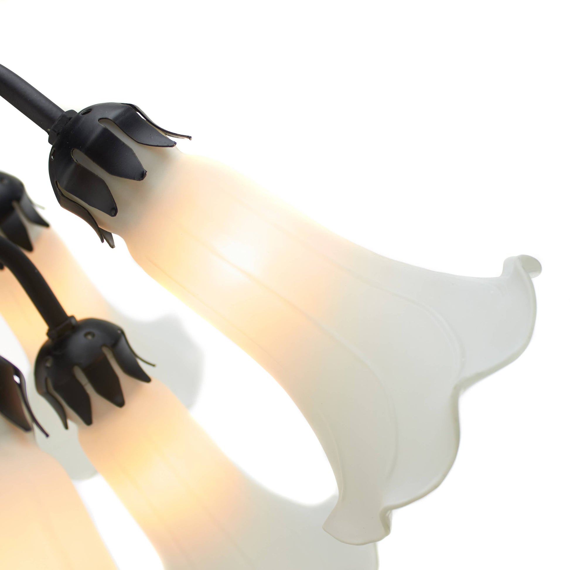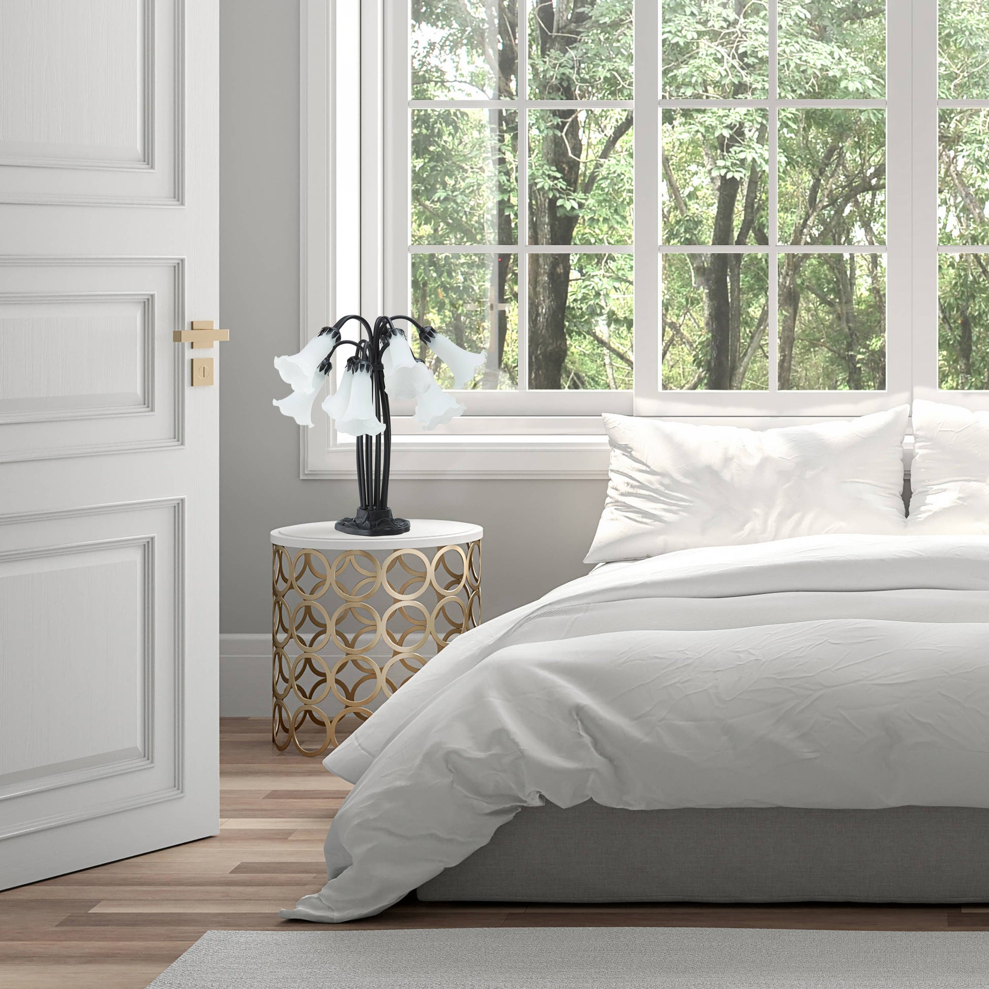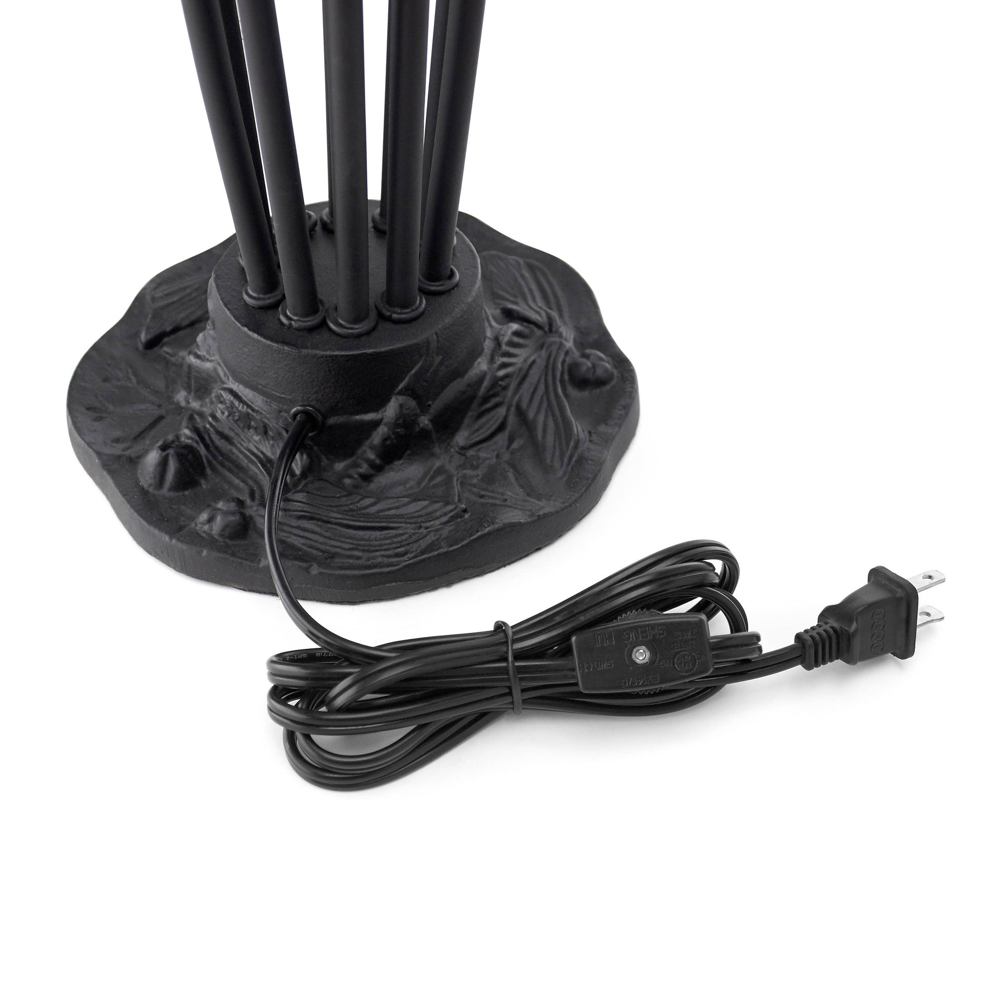 The 21"H Lily 10 Light White Shade Table Lamp from River of Goods marries vintage and traditional styles to create a beautiful and unique lighting option for a bedroom, living room or entryway. Showcasing a black-finish novelty metal base that depicts stems leading up to floral-style white glass bell shades, this table lamp casts a soft glow with ten 15-watt E12 bulb (not included). A great pairing with Bohemian, transitional or eclectic decor, it also features a 65-inch cord with an in-line switch for versatile placement.