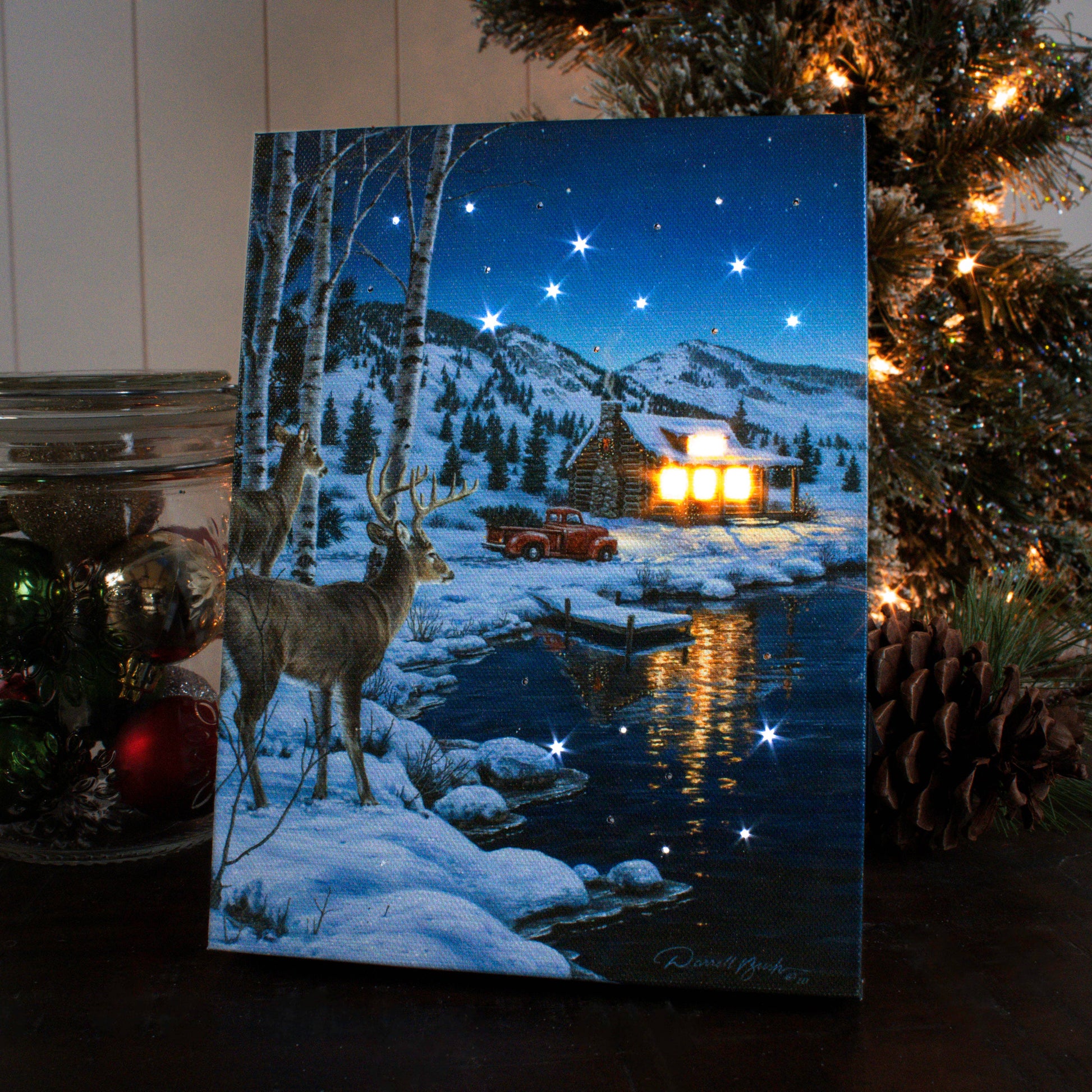 A cozy cabin with twinkling lights stands proudly beside a snow-covered dock, where a charming red truck sits parked. The warm glow of the cabin's windows invites you in, promising a night of comfort and romance. With its soft lighting and tranquil ambiance, it's the perfect setting for a romantic evening with your loved one.