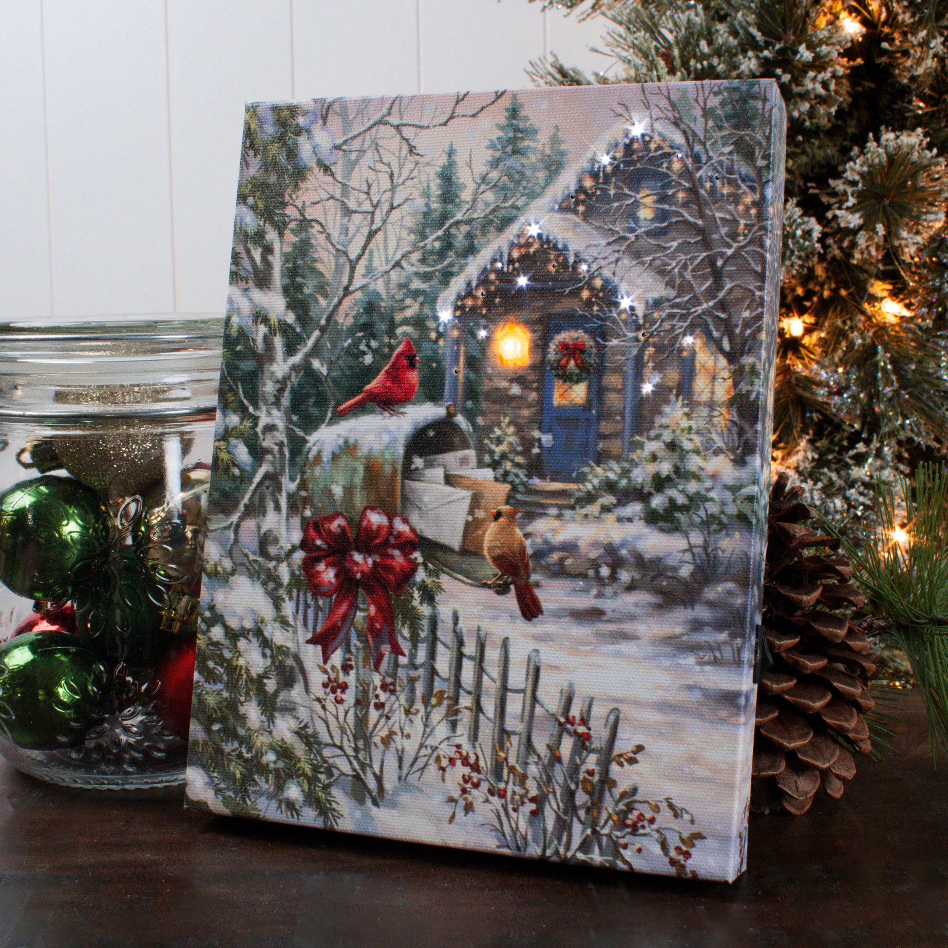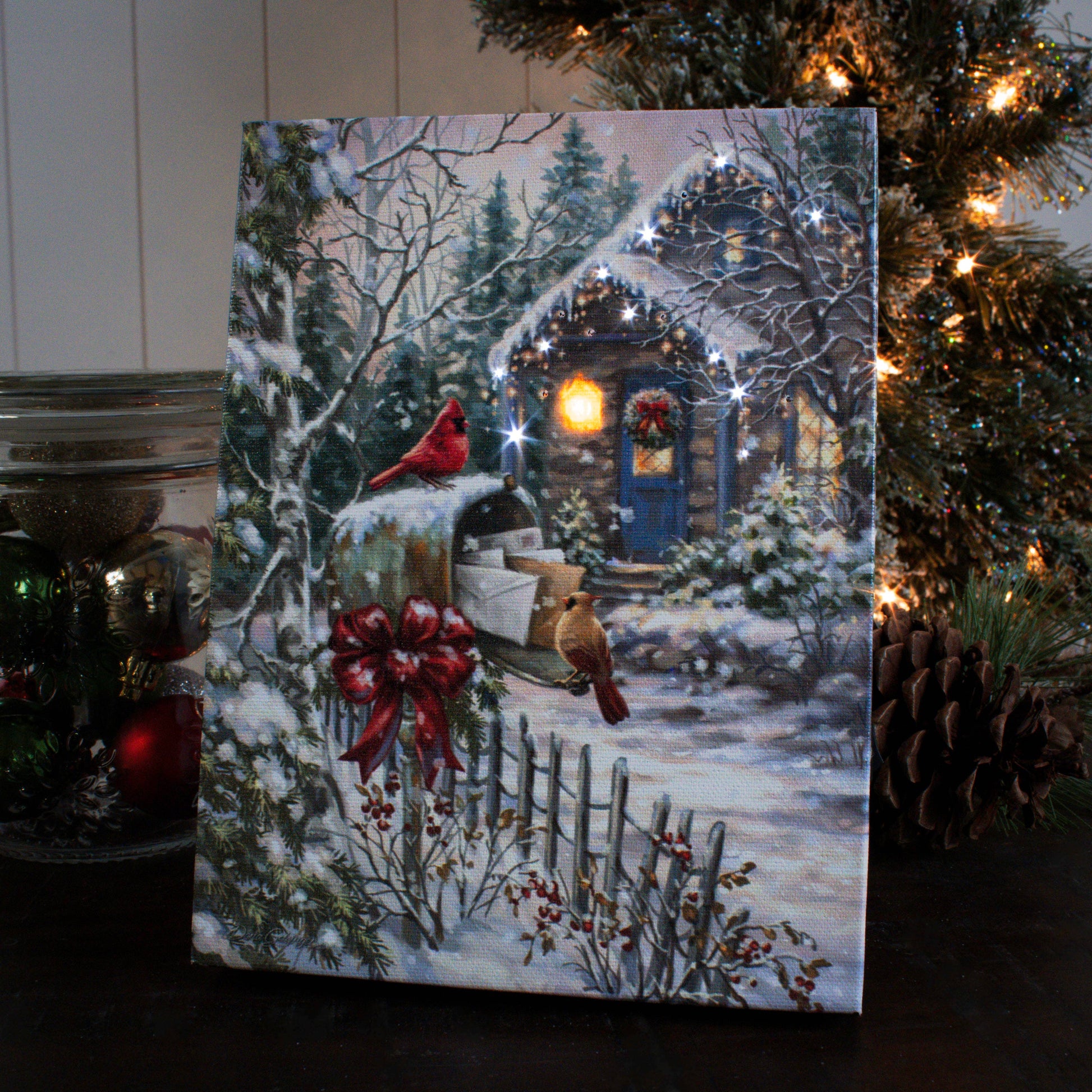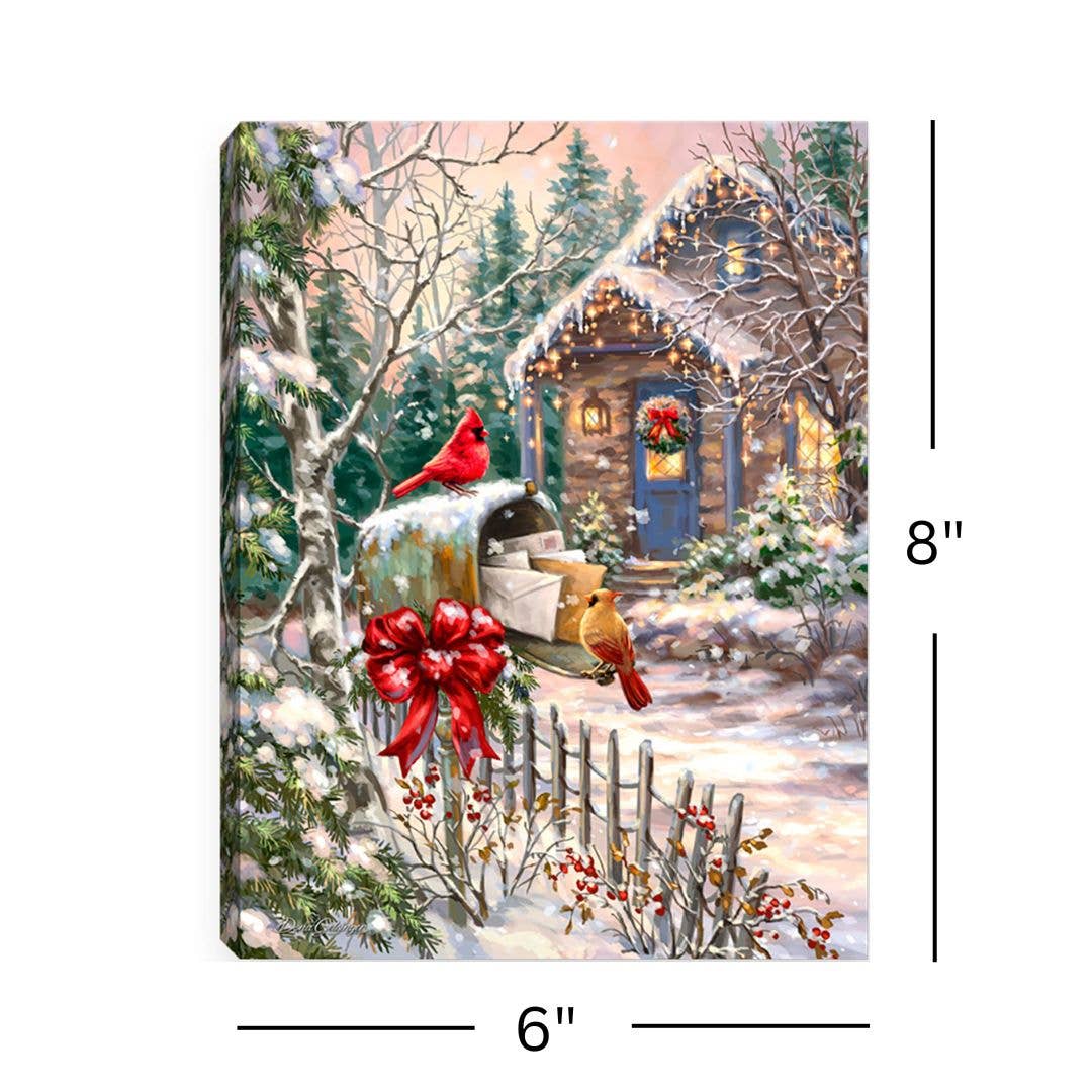 Bring a touch of love and warmth to your home with the Cardinal Cottage 8x6 Lighted Tabletop Canvas. This enchanting canvas captures the essence of romance, as two cardinals stand atop a mailbox overflowing with heartfelt letters.