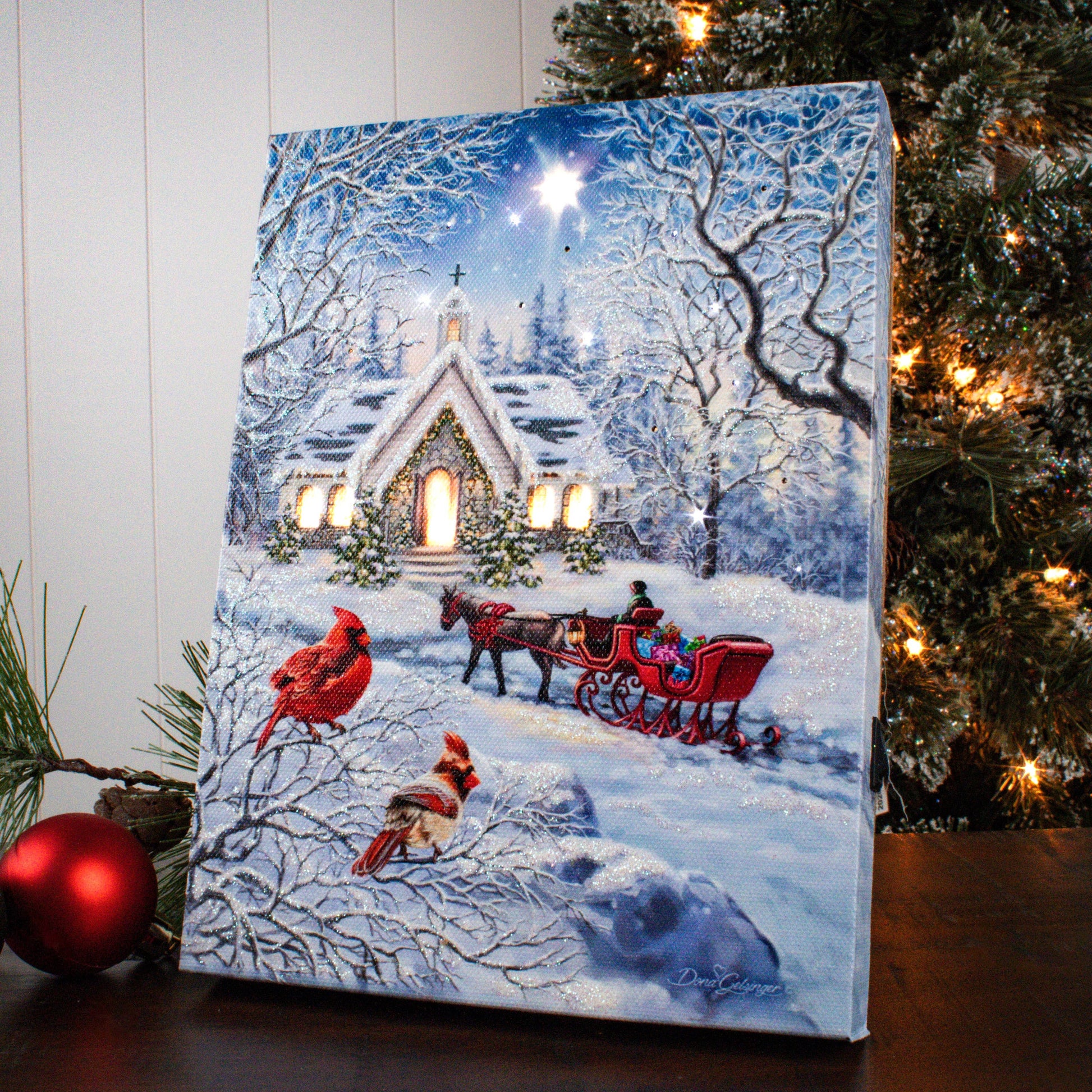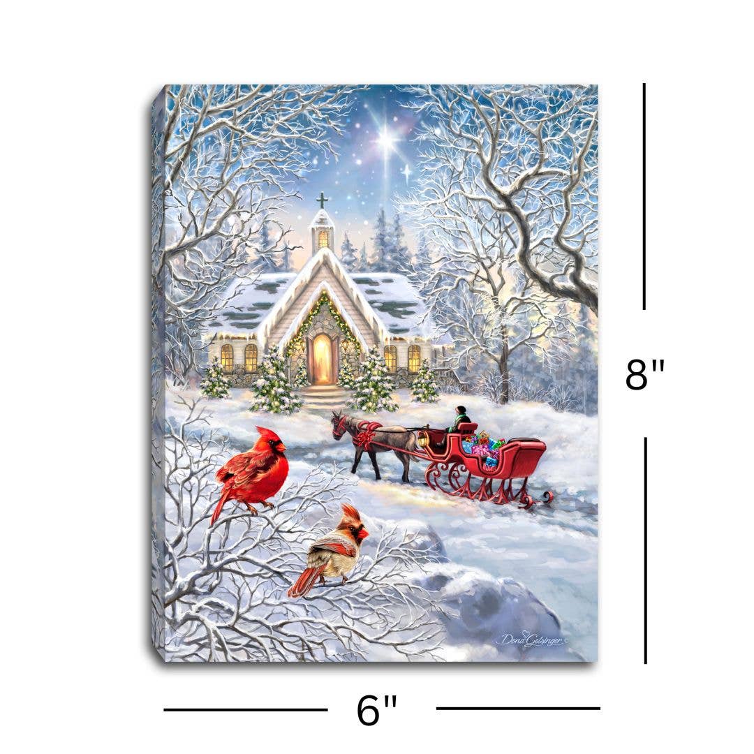 Capture the magic of the holiday season with our Christmas Journey 8x6 Lighted Tabletop Canvas. This stunning piece features two cardinals nestled in a snow-covered bush, bringing a touch of natural beauty to your home. But that's not all - a red horse-drawn carriage filled with presents rides in front of a charming small-time chapel. And to top it all off, a bright star shines above, adding a truly magical touch.