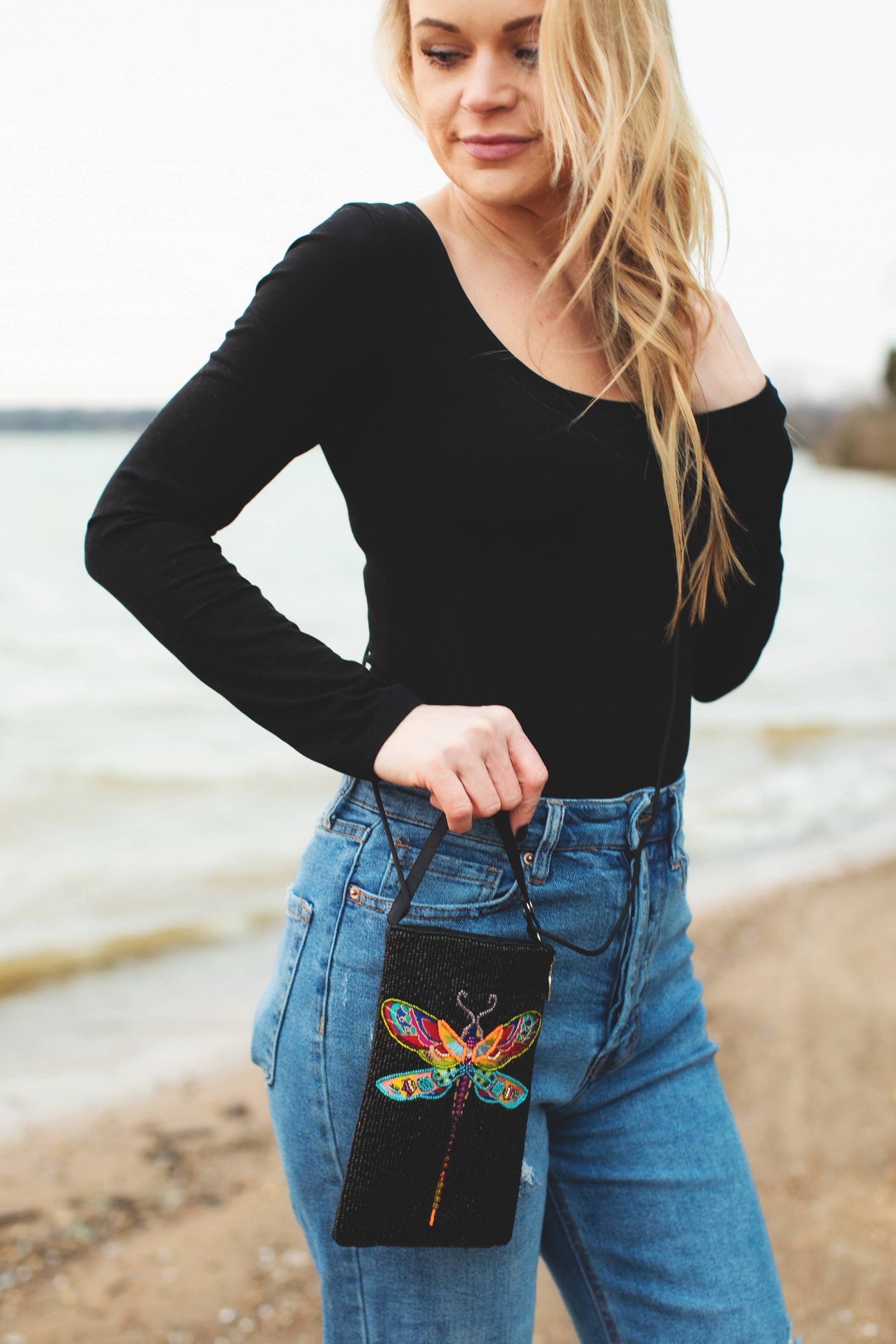 This delightful Club Bag features a brightly colored embroidered dragonfly with beaded accents!