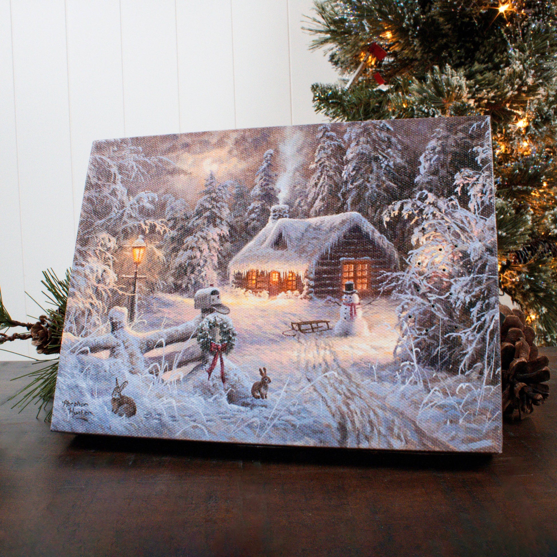 Escape into a winter wonderland with our Holiday Home 8x6 Lighted Tabletop Canvas. The perfect addition to your holiday decor, this canvas captures the essence of a snowy retreat. At the center of the scene, two adorable rabbits stand beside a snow-covered fence, decorated with a festive wreath and a mailbox, patiently waiting for a special delivery. Behind them stands a shining lamp post, lighting up the snow-covered path that leads to a cozy cabin.