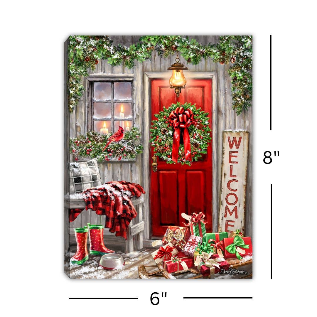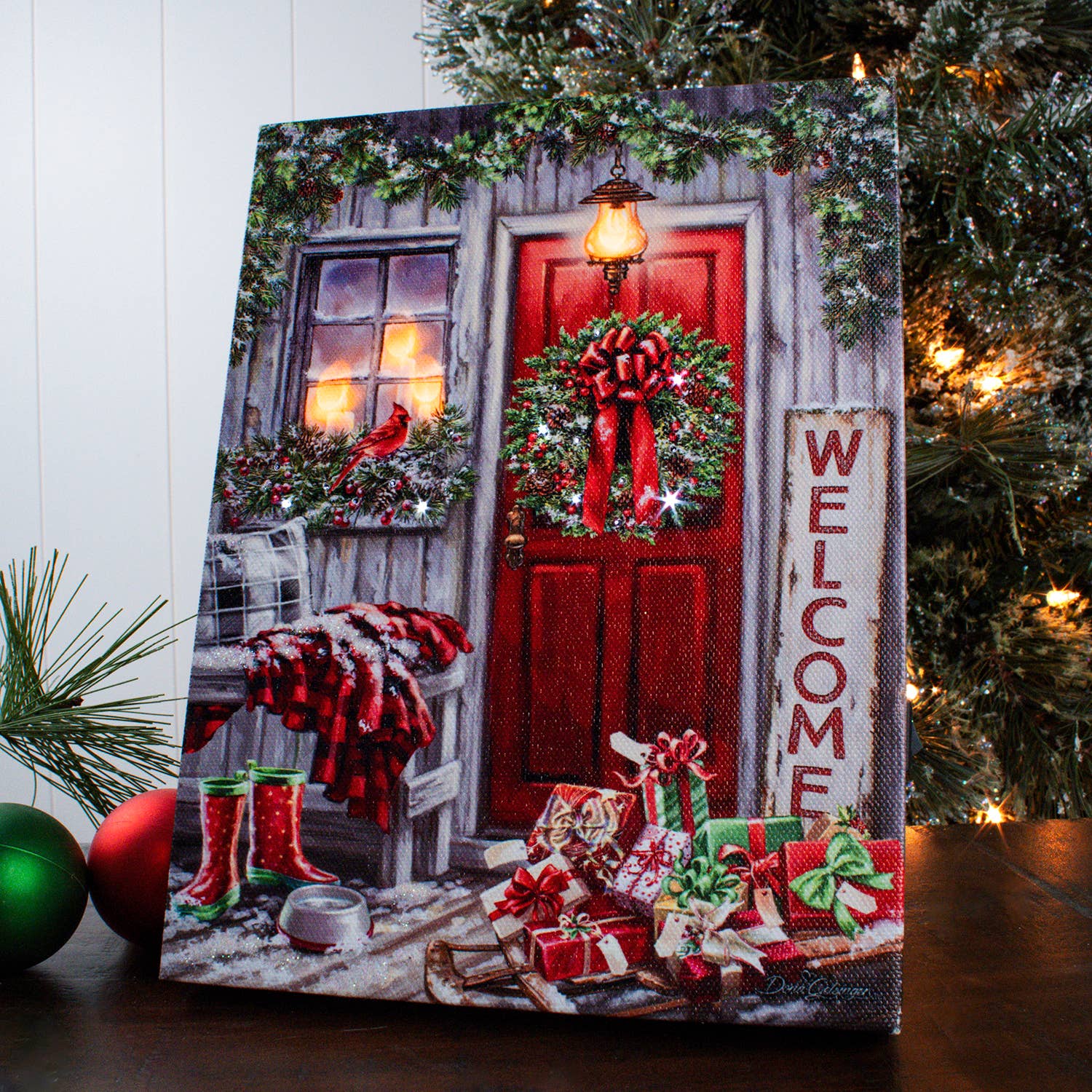 Step into a heartwarming holiday scene with our Home for Christmas Lighted Tabletop Canvas. A charming red door beckons you in, adorned with a festive wreath and bow that sets the tone for a merry celebration. The "welcome" sign on the door is a delightful touch that instantly makes you feel at home.