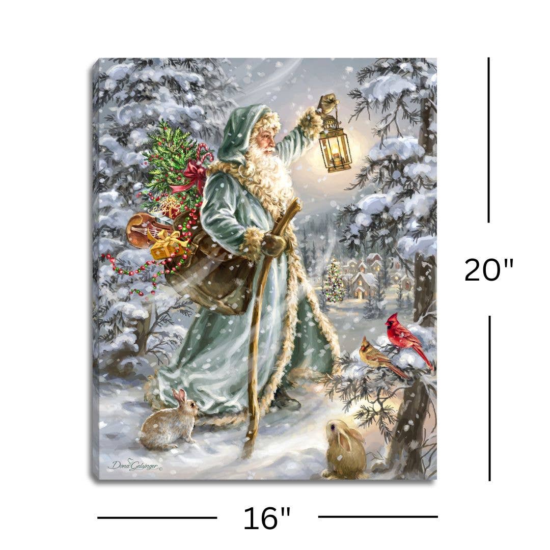 Experience the magic of Christmas with our Saint Nicholas 16x20 Fiber Optic Canvas. This enchanting canvas depicts Saint Nicholas braving a snowstorm with a bag full of toys and a lantern to guide his way. As he walks through the winter wonderland, he is accompanied by adorable bunnies and charming cardinals who stand by his side.