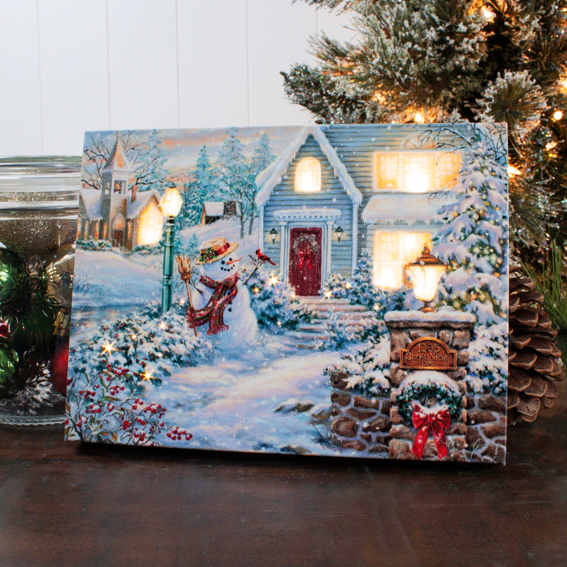 Step into a winter wonderland of love and joy with our Silent Night Lane 8x6 Lighted Tabletop Canvas. This enchanting scene captures the magic of the season with a jolly snowman standing proudly by a lamp post in front of a charming home. Dressed in a cozy scarf, hat, and holding a broom, this lovable snowman welcomes all with open arms.