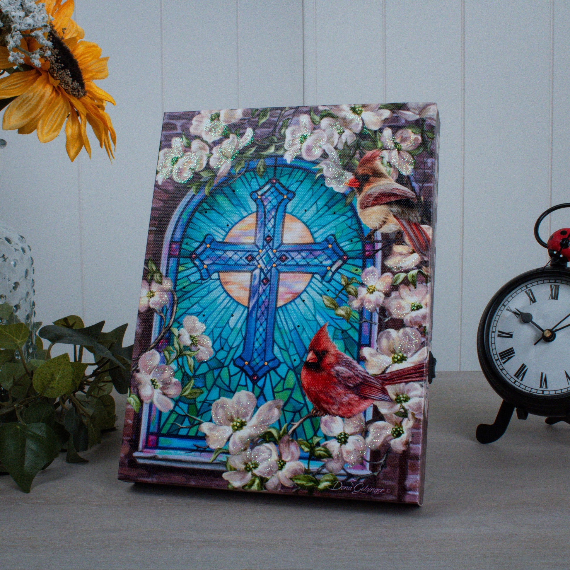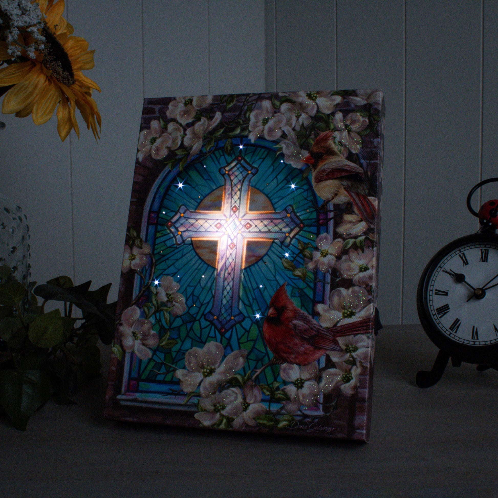 At 8" x 6", this lighted canvas uses Fiber Optic/LED technology to illuminate the stained-glass cross and surrounding details with a gentle, radiant glow.