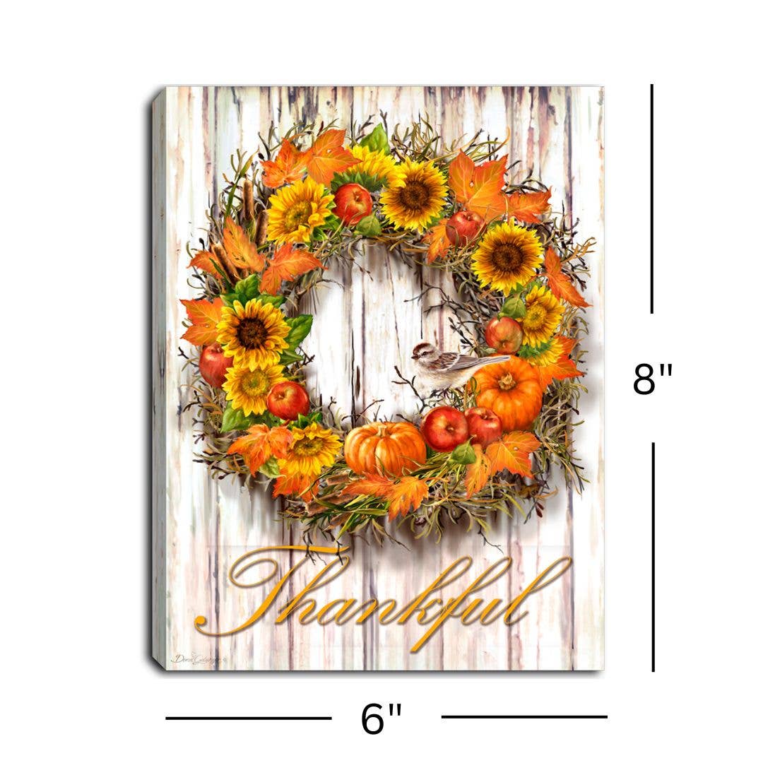 Celebrate the season of love and gratitude with our Thankful 8x6 Lighted Tabletop Canvas. This exquisite piece of art captures the essence of autumn with a stunning wreath adorned with orange leaves, pumpkins, apples, and sunflowers. A charming bird perched on the wreath adds a touch of whimsy to the scene.