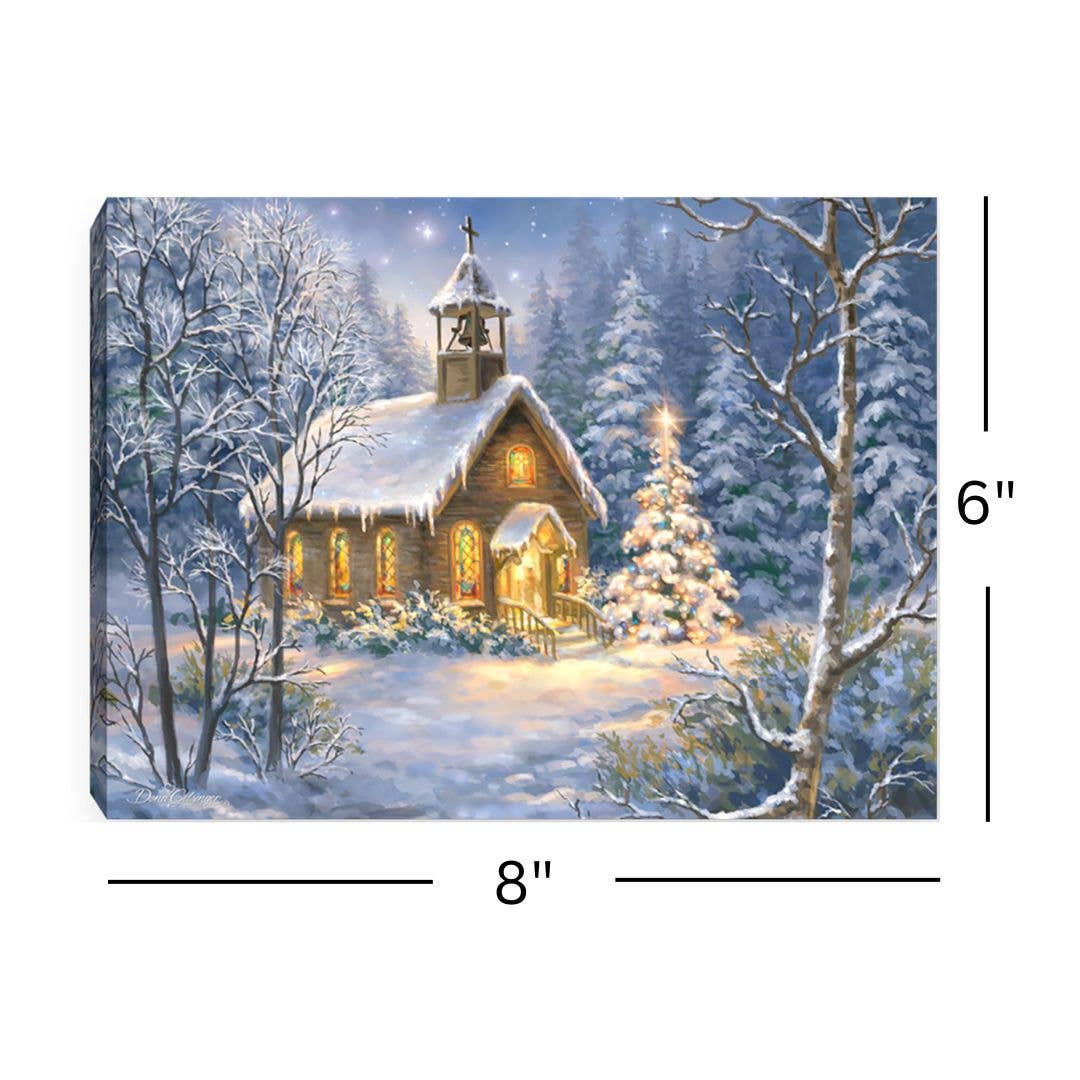 Experience the magic of a winter wonderland with The Chapel 8x6 Lighted Tabletop Canvas. Imagine walking through a snow-covered forest, and stumbling upon a quaint chapel nestled among the trees. The LED lights within the chapel cast a warm glow, inviting you to step inside and take refuge from the chilly winter air.